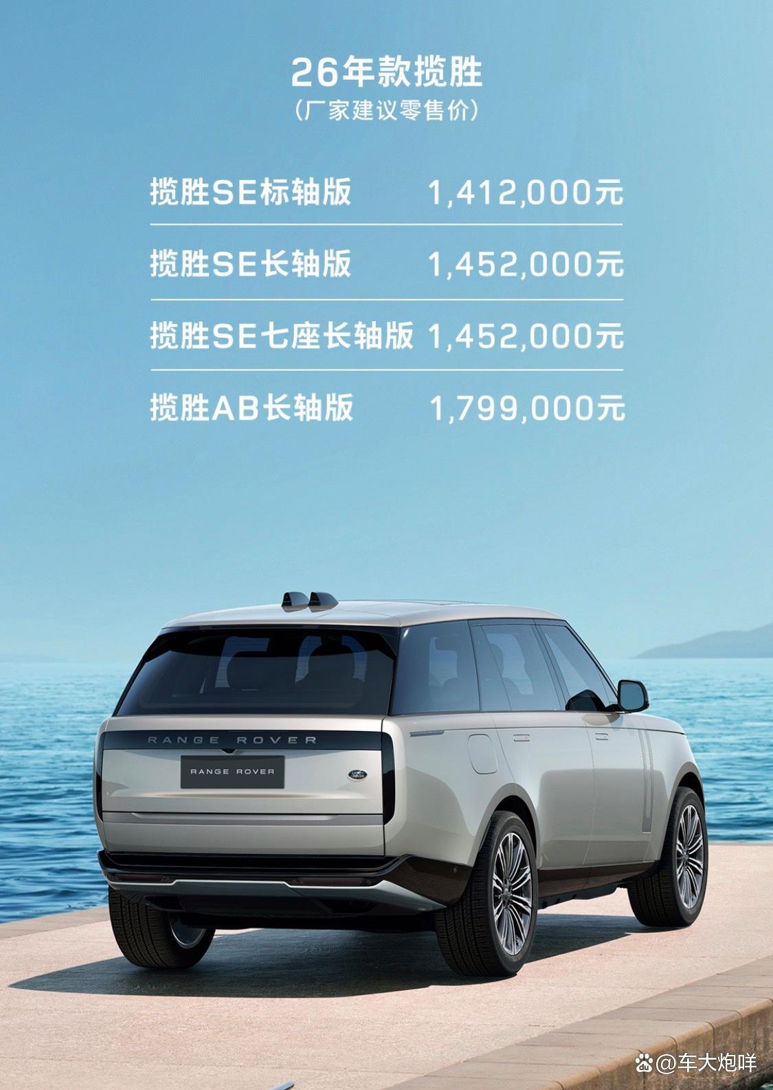 3月3日,我们从路虎官方获悉,2026款路虎揽胜现已正式上市,共推出4款车型,官方指导价141.2万元起。本次改款焕新的一大看点便是引入揽胜AB长轴版,官方售价179.9万元,可以视为2026款路虎揽胜的顶配车型。