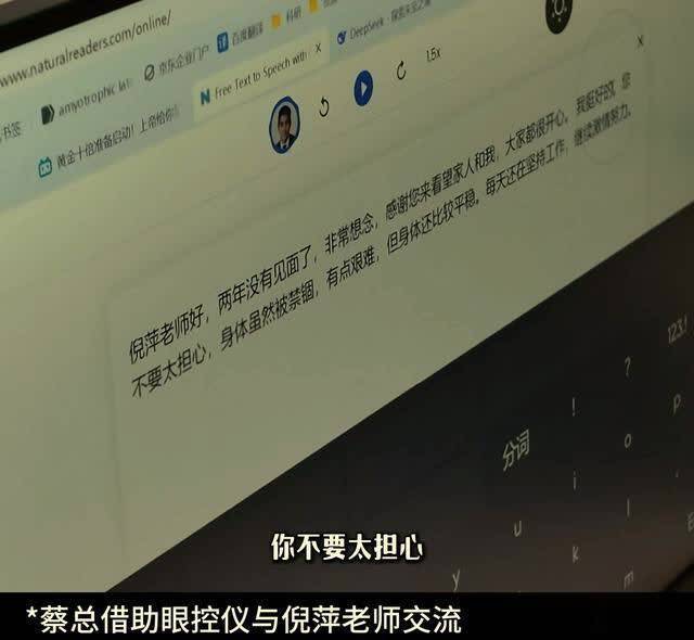 蔡磊的状况现在比较差,身体早已不能动弹,目前只能通过眼控仪来控制电脑打字,跟人交流;蔡磊用这种方式跟倪萍打招呼:
