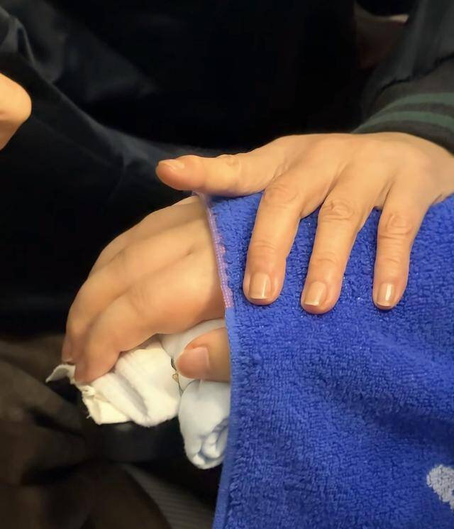 倪萍紧挨着蔡磊坐下,她两手搭在蔡磊浮肿的手上,一边不停的为他轻轻搓着,一边鼓励蔡磊。