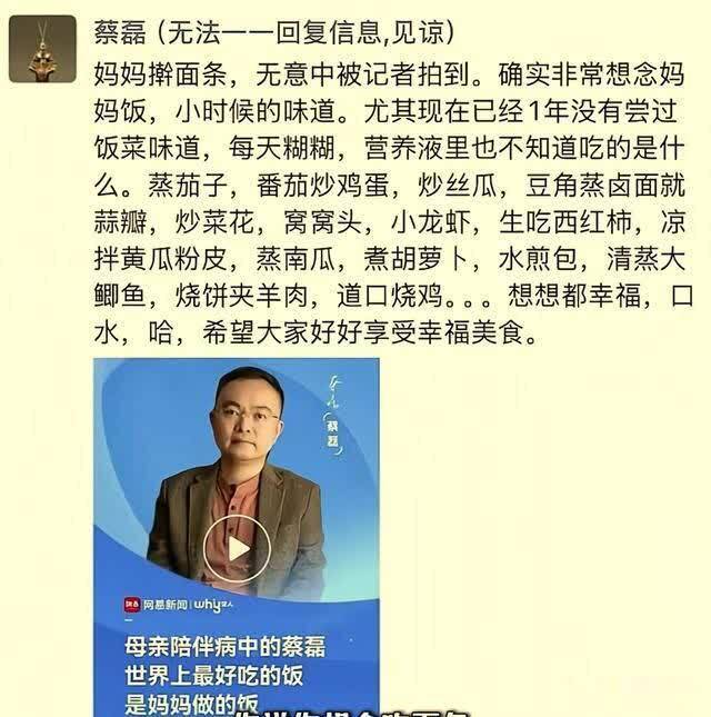 倪萍有关注到,之前蔡磊发微博说,很久没能吃妈妈做的手擀面了;蔡磊因为病情原因,很长一段时间一直在吃流食。