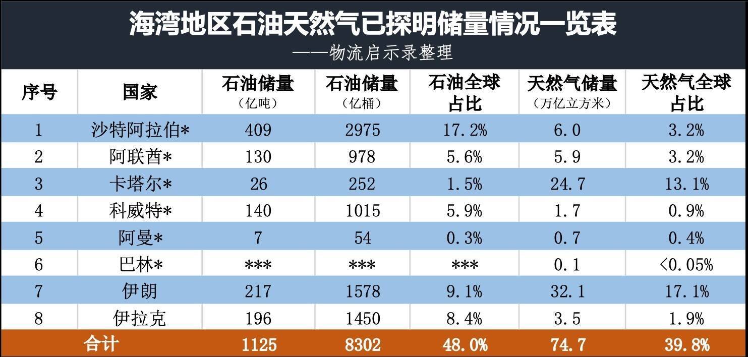 根据《BP世界能源统计年鉴》(第70版),海湾八国已探明石油储量1125亿吨(8302亿桶),占全球比例为48%;天然气储量74.7万亿立方米,占全球比例为39.8%。