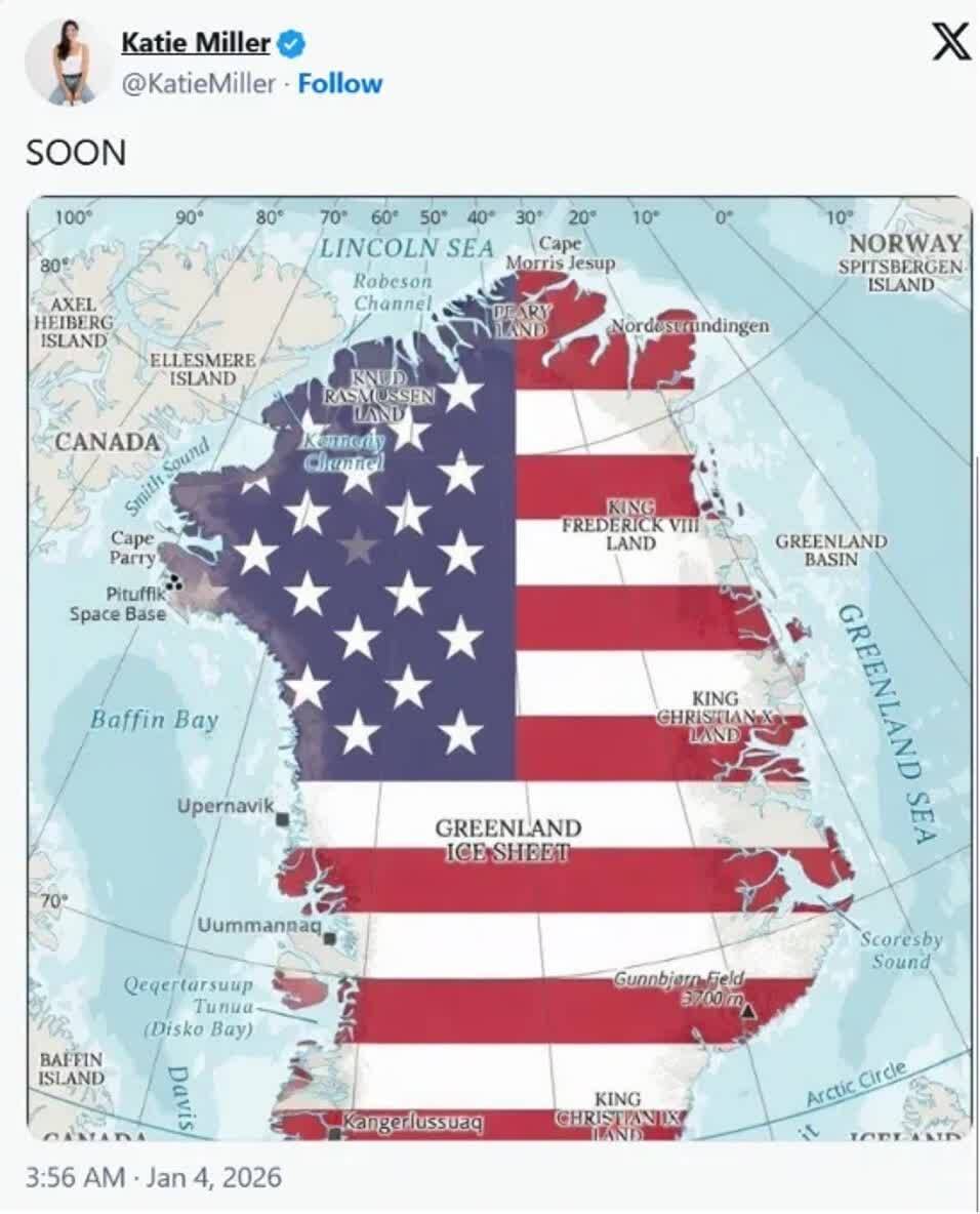 Katie Miller发布美国旗帜覆盖格陵兰岛的图片
